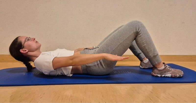 Leže na hrbtu potegnemo popek proti hrbtenici za aktivacijo globoke trebušne mišice in z izdihom dvignemo glavo in ramena od podlage do točke, da se rahlo tresemo. Položaj poskušamo zadržati 10s nato pa glavo počasi spustimo nazaj na podlago in sprostimo trebuh. Vajo ponovimo 10x.